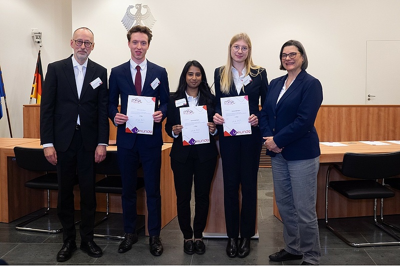 Am 14. Januar 2026 fand in den Räumlichkeiten des Bundessozialgerichts der erste Moot-Court im Sozialrecht statt. Zehn studentische Teams aus Universitäten in ganz Deutschland traten in einer simulierten Gerichtsverhandlung gegeneinander an und überzeugten mit juristischem Können sowie professionellem Auftreten. Thematisch waren die Verhandlungen im Rentenrecht angesiedelt. Prof. Dr. Stefan Greiner und Dr. Ansgar Kalle betreuten gemeinsam mit Rechtsanwältin Bettina Schmidt zwei Teams. Das erste bestand aus Nivachini Amirthalingam, Annika Flamme und Tim Munoz Andres, das zweite aus Luise Eibach, Sophia Kons, Anna Sigulla, Svea Totzke. Beide Teams übernahmen die Rolle der Beklagten, der Deutschen Rentenversicherung, und manövrierten sich in ihren Plädoyers souverän durch das SGB VI und dessen verfassungsrechtliche Bezüge. Das Team um Amirthalingam, Flamme und Munoz Andres überzeugte die Jury mit seinem Auftritt und erzielte den Zweiten Platz. Der Lehrstuhl Greiner gratuliert herzlich!