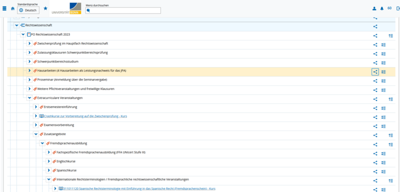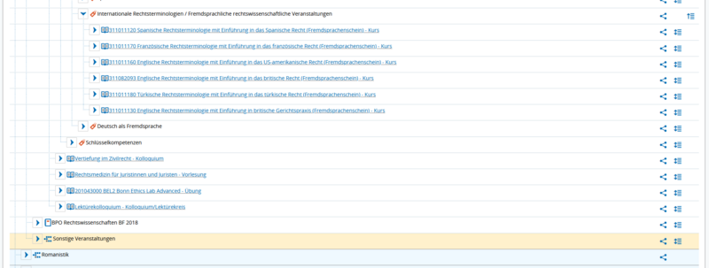 3. Öffnen Sie die folgenden Ebenen: "PO Rechtswissenschaft 2023" -> "Extracurriculare Veranstaltungen" -> "Zusatzangebote" -> "Fremdsprachenausbildung" -> "Internationale Rechtsterminologien/Fremdsprachliche rechtswissenschaftliche Veranstaltungen". Dort finden Sie eine Auflistung aller Veranstaltungen der Internationalen Rechtsterminologien, die in dem jeweiligen Semester angeboten werden. Klicke hier um auf die Baumkansicht zu kommen.