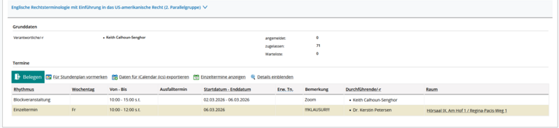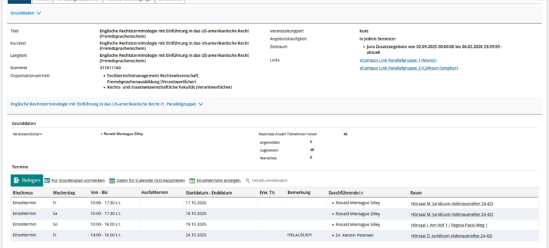 4. Um sich für eine Veranstaltung anzumelden, klicken Sie in der Baumansicht auf die entsprechende Veranstaltung (hier am Beispiel von Englische Rechtsterminologie mit Einführung in das US-amerikanische Recht). Sollten (wie hier) mehrere Parallelgruppen existieren, beachten Sie bitte, dass es sich dabei NICHT um dieselbe, sondern zwei unterschiedliche Veranstaltungen bei verschiedenen Dozierenden handelt. Lesen Sie daher genau und melden Sie sich bei der von Ihnen gewünschten Veranstaltung über den türkisfarbenen Button mit der Aufschrift "Belegen" an.